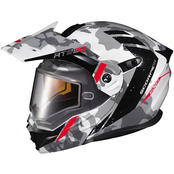 The EXO AT950, a versatile modular Adventure Touring helmet has features and quality that you would expect to pay more for. It can be used as a full face adventure helmet with external peak visor attached or the peak visor can be removed and you have an aerodynamic touring helmet. Scorpion’s oversized eyeport is extremely wide for greater peripheral vision and downward visibility, and the modular chin bar can be conveniently flipped up when needed. The internal drop down SpeedView sun visor and KwikWick II liner will keep you comfortable all day long even as lighting conditions change throughout the day. Additionally, the No fog Everclear face shield can be removed and you can use the EXO AT950 as a dirt helmet with goggles for off road use. Various shell sizes made of Advanced LG Polycarbonate and dual density EPS (Expanded Polystyrene), result in a helmet that is light weight, strong and protective.
